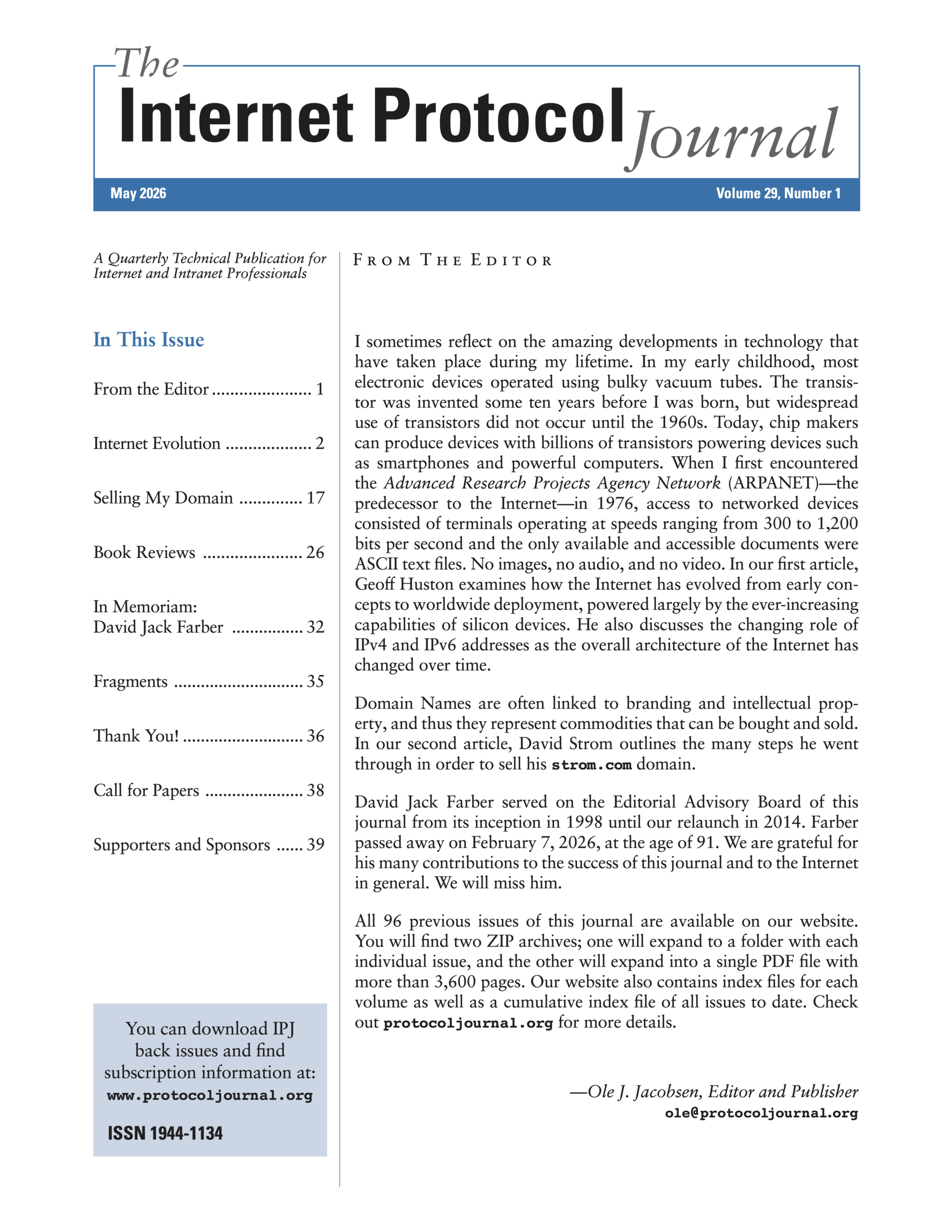 The Internet Protocol Journal (IPJ) is a quarterly technical publication containing tutorial articles (“What is…?”), as well as implementation/ operation articles (“How to…”). The journal provides articles about all aspects of Internet technology. IPJ is not intended to promote any specific products or services, but rather is intended to serve as an informational and educational resource for engineering professionals involved in the design, development, and operation of public and private internets and intranets. In addition to feature-length articles, IPJ contains technical updates, book reviews, announcements, opinion columns, and letters to the Editor.